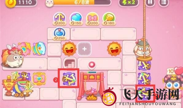 1、关键布局,先在左侧设立蝴蝶结炮台并升至二级,随后在右侧加入船锚炮台,资金允许时务必升级。