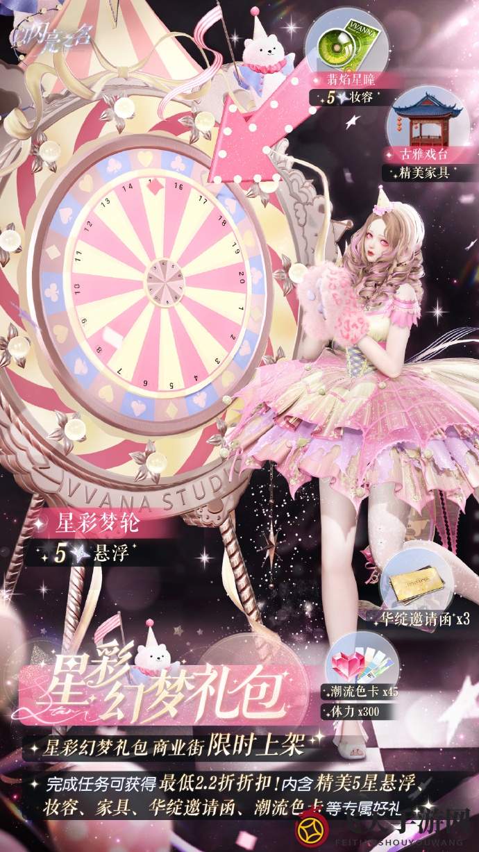 礼包销售期间,玩家通过完成限定任务即可享受折扣优惠。完成全部4个任务,最高可享2.2折优惠!超值礼包等你来拿!内含五星限定悬浮【星彩梦轮】、五星妆容【翡焰星瞳】、精美家具【古雅戏台】、华绽邀请函*3、体力*300和潮流色卡*45。