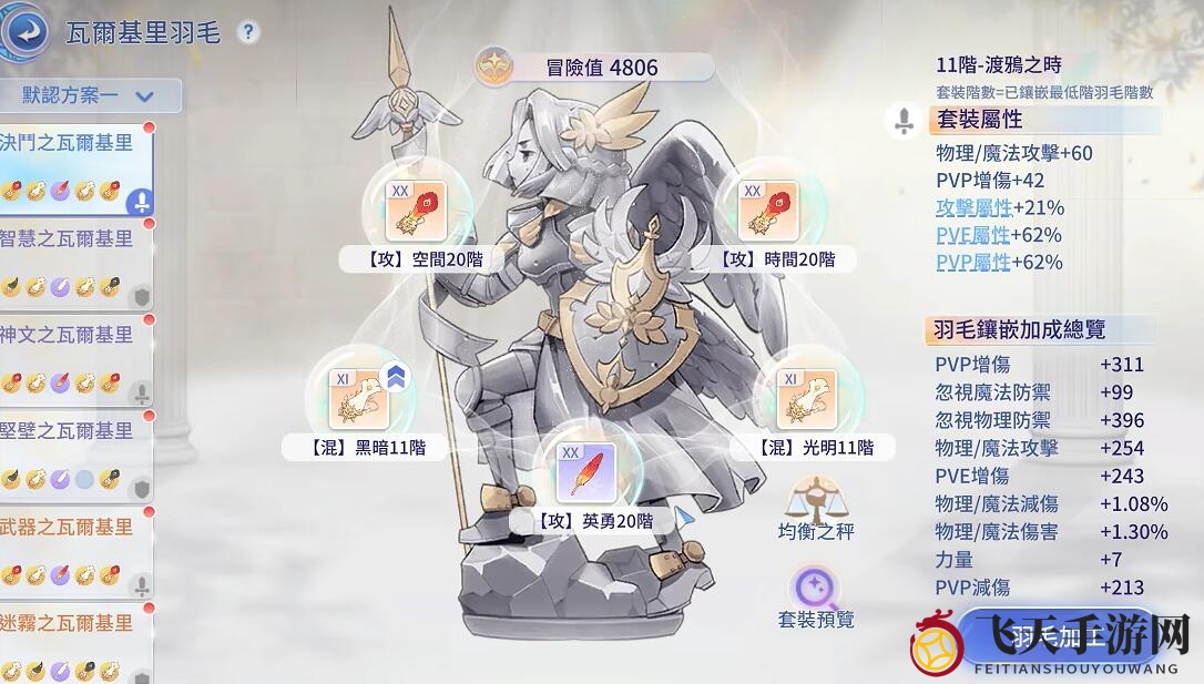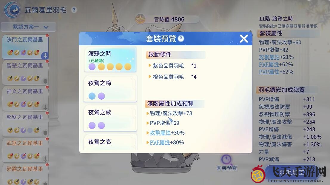 1、玩家需在瓦尔基里羽毛中凑齐四金一紫的配置,此举旨在凑齐羽毛套装。