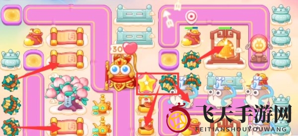 1、本关可用炮塔包括:毒针、多重箭、泡泡塔、星星、雷达。在这个关卡中,我们重点依赖多重箭的力量来击退敌人。