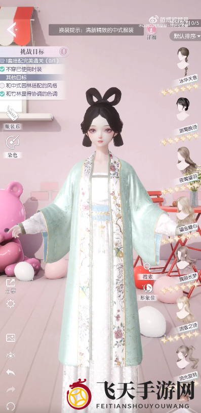 亦或分步骤搭配,先着中式三件套,再搭配清纯华丽的服饰配饰,最后穿上浅绿色系的华丽服饰。