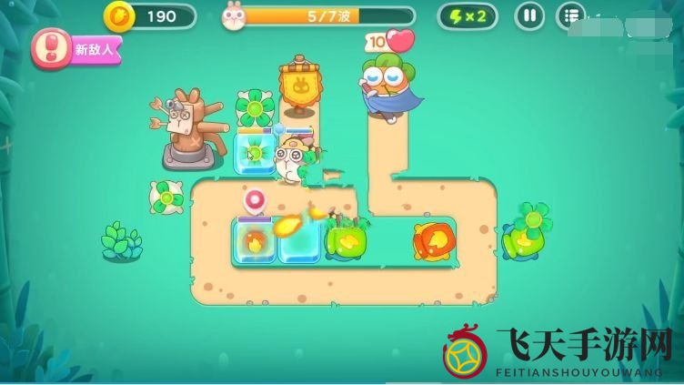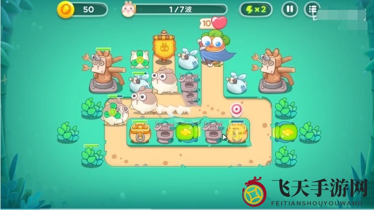 1、首先,在出口区域布置一个风扇,既能清理地图又能攻击兔兔,然后在下方中央位置种下一个炮塔,以拓展视野。