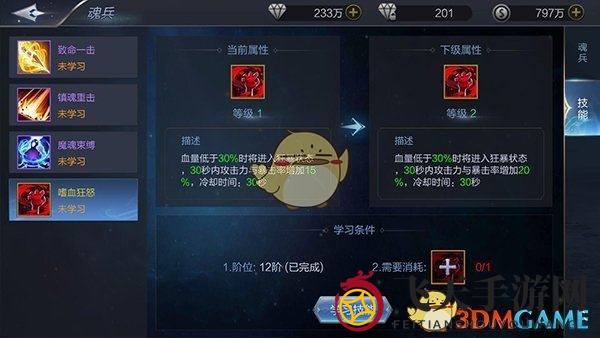 玩家血量低于30%时进入狂暴状态,30秒内提升攻击力和暴击率。(需达到12阶,并拥有雷霆一怒技能书)