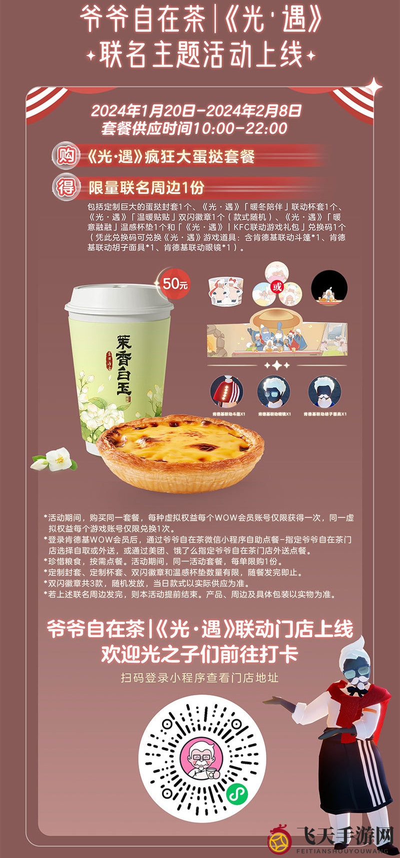 1月19日至2月8日,在全国肯德基餐厅购买联动套餐,即可获得肯德基联动斗篷、胡子面具、眼镜等精美服饰。详情请留意官方公告。