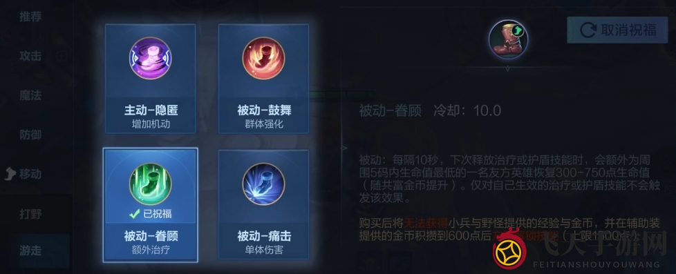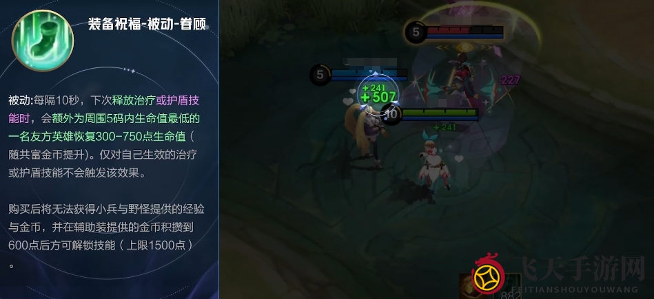 “眷顾”的被动效果是每10秒治疗或护盾技能为血量最少的队友恢复300至750点生命值,非常适合擅长保护队友的角色,但需积累600个单位辅助资金,最高1500个。