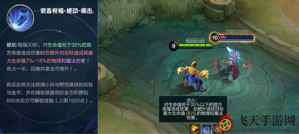 “痛击”被动效果是每30秒对血量较低的敌人造成7%至18%额外伤害,适合追求快速击杀的玩家,需放弃击杀小兵或野怪获取经验与金钱,至少600个单位启动,最高1500个。