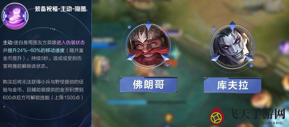 “隐匿”主动祝福使施法者及其盟友短暂隐身,提升24%至60%的移动速度,持续五秒,一旦受到伤害或造成伤害即失效,使用时需消耗常规资源,至少600个单位启动,最多1500个。