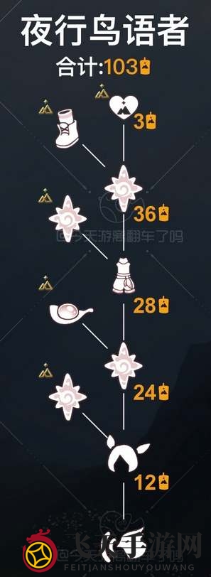 3、夜鸟语者先祖的兑换物品清单如下,若想收集全部道具,需积攒103个季节蜡烛。这些道具包括独特的叫声、发型、裤子、鞋子等,玩家可按个人喜好自由挑选。