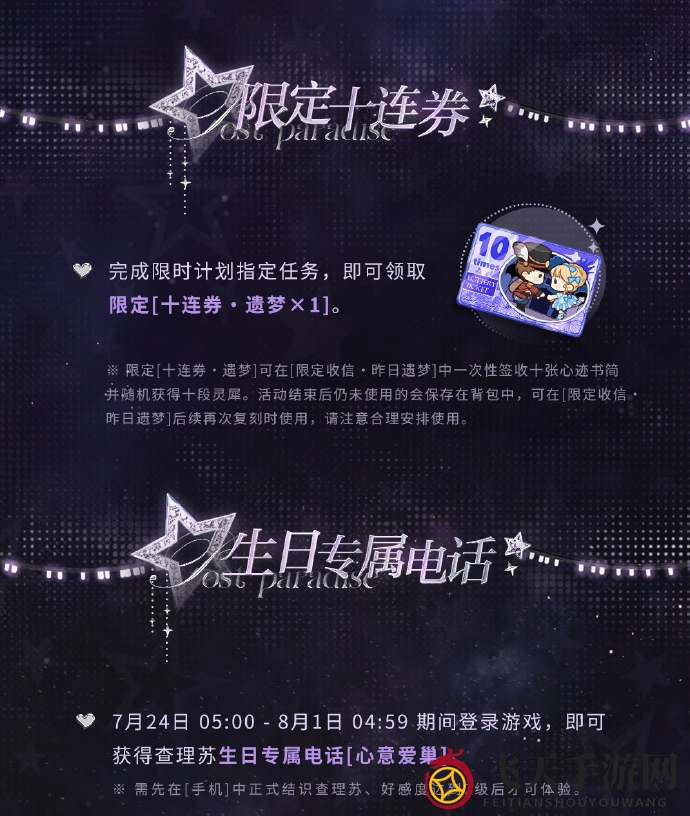 7月24日 05:00 - 8月1日 04:59期间登录游戏,你将获得查理苏生日专属电话[心意爱巢]。请注意,你需要先在[手机]中正式结识查理苏、好感度达到2级后才能体验。