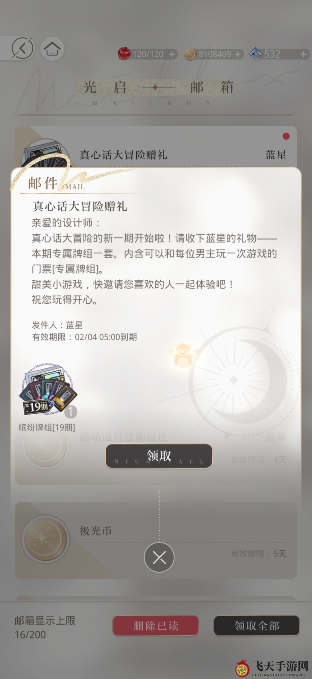 1、玩家们可以通过邮箱免费获得一套第19期真心话大冒险牌,其余三套则需前往购物→五区→迷境,用【星旅币】进行兑换,本期的兑换仅需【1800星旅币】。