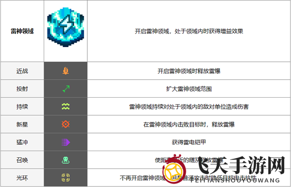 1、雷神领域拥有丰富的增益效果,涉及近战、投射、移动和光环等多个领域。