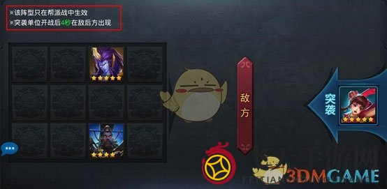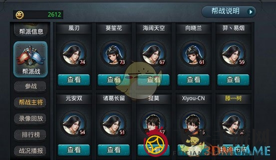 帮派战采用擂台战模式,双方第一顺位成员交锋,一方3名英雄全部阵亡则本回合结束,败方换下一位成员,胜者保留剩余血量,以此类推,直至一方全部成员落败。