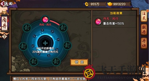 七个槽位内丹,注灵丹元,属性加成各异。注入丹元,属性强化,战斗力再上一层楼。