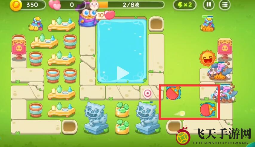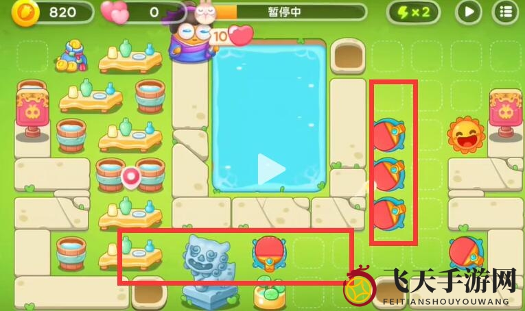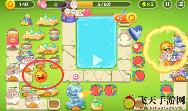 1、巧布阵型,将太阳置于右侧出口,轻松化解兔子和建筑的双重威胁。