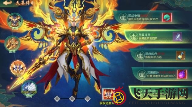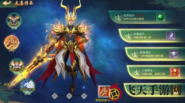 尊崇之选,绝世神装——天尊传承套装,共分四大篇章,涵盖服饰、武器、羽翼与坐骑,每篇章15个任务点,全部达成,尊贵奖励唾手可得。