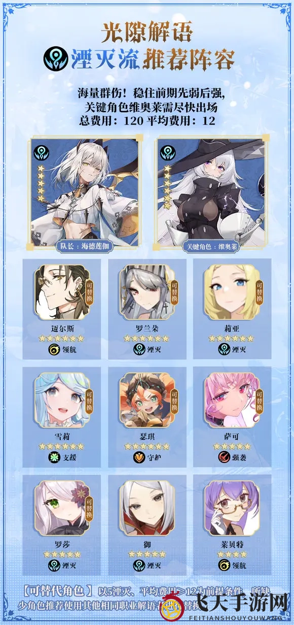 队员:维奥莱(核心输出)+御(核心辅助)+莱贝特(辅助领航回费)+3个湮灭(凑齐5个湮灭激活队长被动,由于6星成本高昂,可考虑用低星替代)+奶(有洛忒斯则选用洛忒斯,无则莉莉)+迈尔斯(可替换,由于湮灭卡牌费用较高,需大量回费支持)