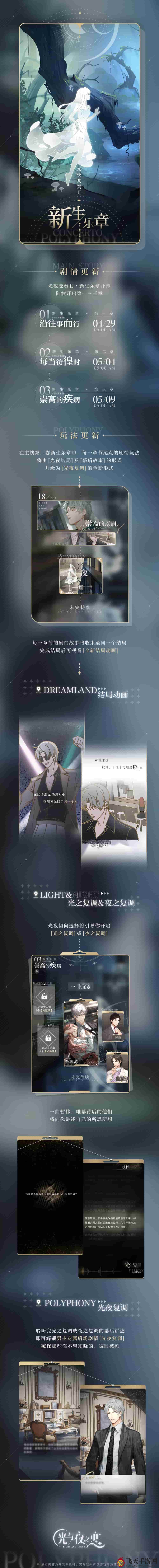 第二卷新生乐章中,章节尾点的剧情将以[光夜复调]新形式呈现,取代之前的[光夜结局]及[幕后故事]。