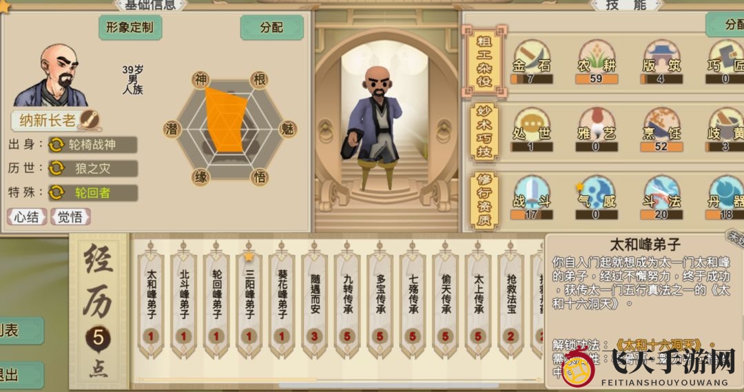 轮回者的魅力在于,你可以自由调整属性和技能。甚至可以将五维提升至极限,将所有技能点数拉满,但我们强烈不建议这样做。因为这个游戏的乐趣在于培养形态各异的角色,见证他们逐渐成长,享受将门派一手培养壮大的成就感,而不是组建一支强大的队伍横扫一切。因此,在塑造角色时,先明确你的发展目标,为轮回者提供一些初始支持,这就足够了。