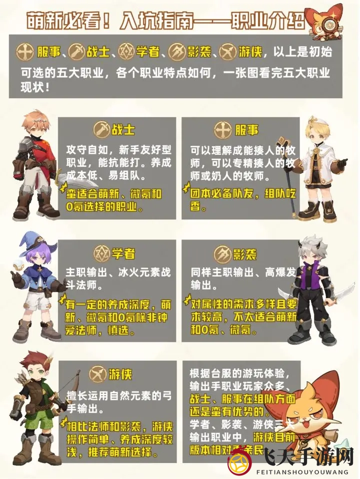 职业一览:影袭(刺客)、剑士(战士)、学者(法师)、服事(奶妈)、游侠(射手)