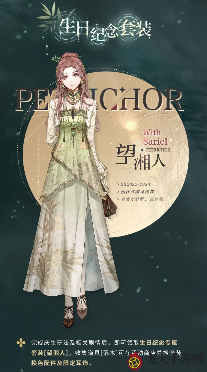 2. 专属套装:完成庆生玩法及相关剧情后,你将获得生日纪念专属套装[望湘人],同时收集道具[落木]可兑换套装换色配件及限定耳饰。