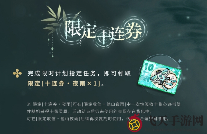 ※ 限定[十连券?夜雨]可在[限定收信?他山夜雨]中一次性签收十张心迹书简并随机获得十张灵犀。活动结束后仍未使用的将保存在背包中,可在[限定收信?他山夜雨]后续复刻时使用,请合理安排使用。