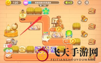 3、本关的核心在于炮塔开图,因此应将炮塔布置在靠近道具的位置,清空一个区域的道具后,出售炮塔并转移到另一个区域。