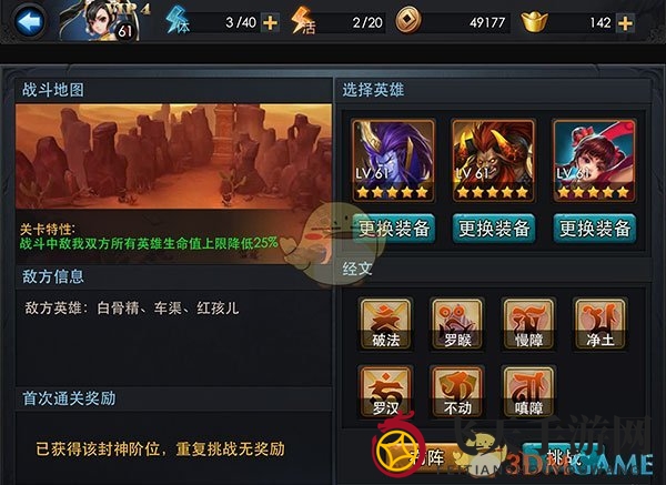 特别推荐虚无、贪障、破法三件法宝,针对法师属性敌人,虚无效果尤为突出。本关独特,英雄生命值上限降低25%,这也解释了地藏为何没被秒,而敌方英雄也显得格外脆弱。
