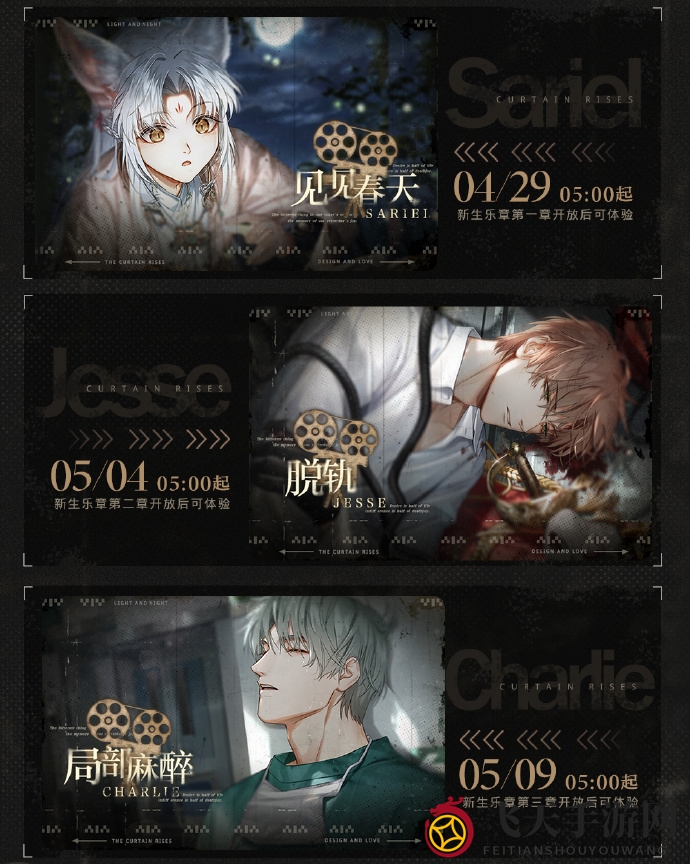 实装时间:玩家们可在限定收信[岁月的缝隙?片影/照幽/狭光]中获取[6星]灵犀 齐司礼?见见春天、[6星]灵犀 夏鸣星?脱轨、[6星]灵犀 查理苏?局部麻醉,于[心动邂逅→记忆→胶片]处开启体验。