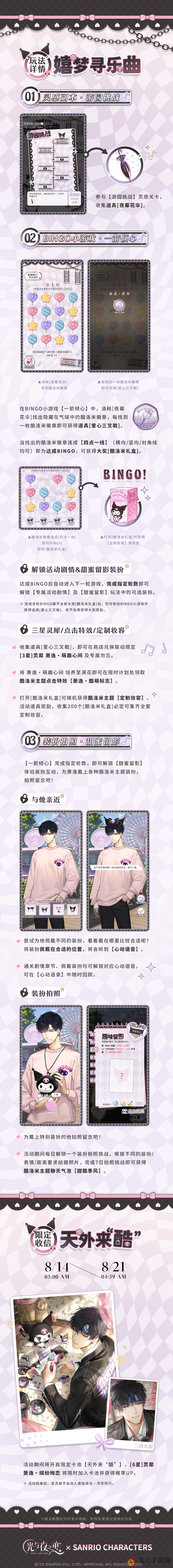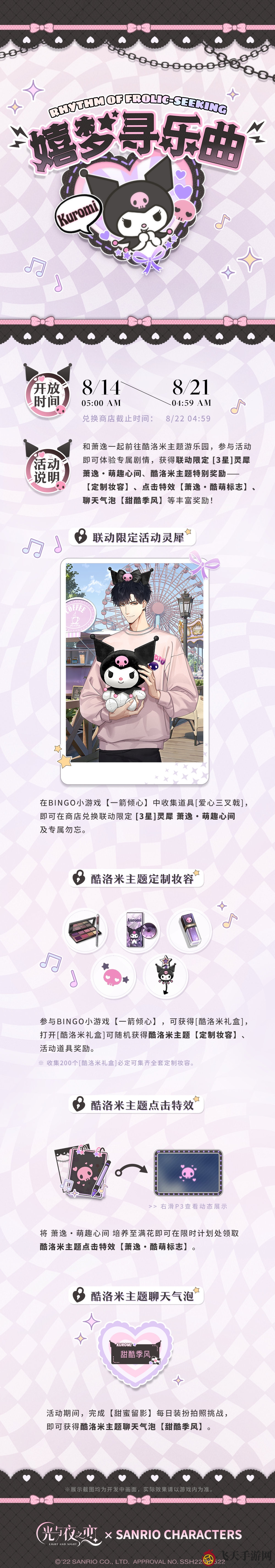 活动亮点:跟随萧逸的足迹,探访库洛米主题乐园,解锁独家剧情,赢取联动限定[3星]灵犀、库洛米主题定制妆容、酷萌点击特效、甜酷季风聊天气泡等多重豪礼!