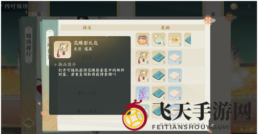 四时锦绣排名前三,即可获得“金风玉露”、“花蝶影”等时尚套装部件,专题奖励,尽显玩家风采。