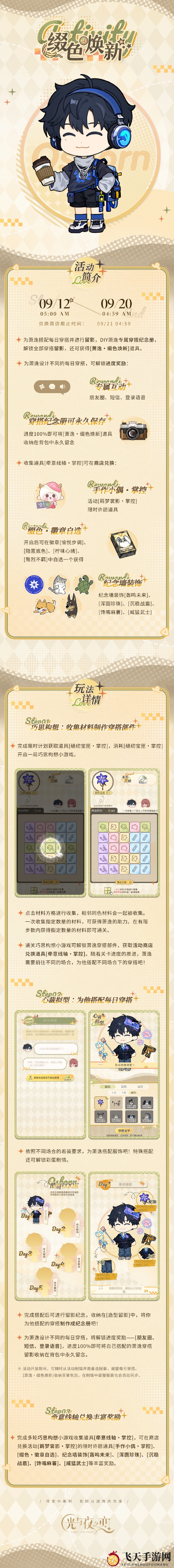①每日为萧逸设计潮流造型,捕捉精彩瞬间,制作专属穿搭纪念册,完成所有挑战,赢取[萧逸・缀色焕新]专属道具。