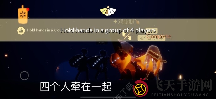 完成方法:四位玩家手拉手,或在表演季剧场右侧洞口火盆边静坐,重温季节的感动。