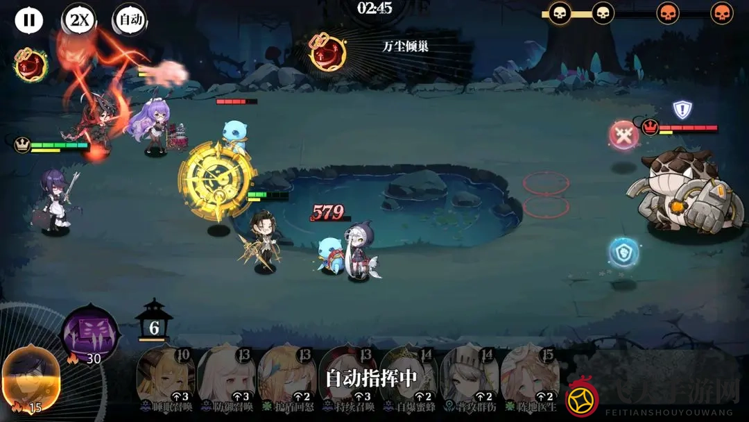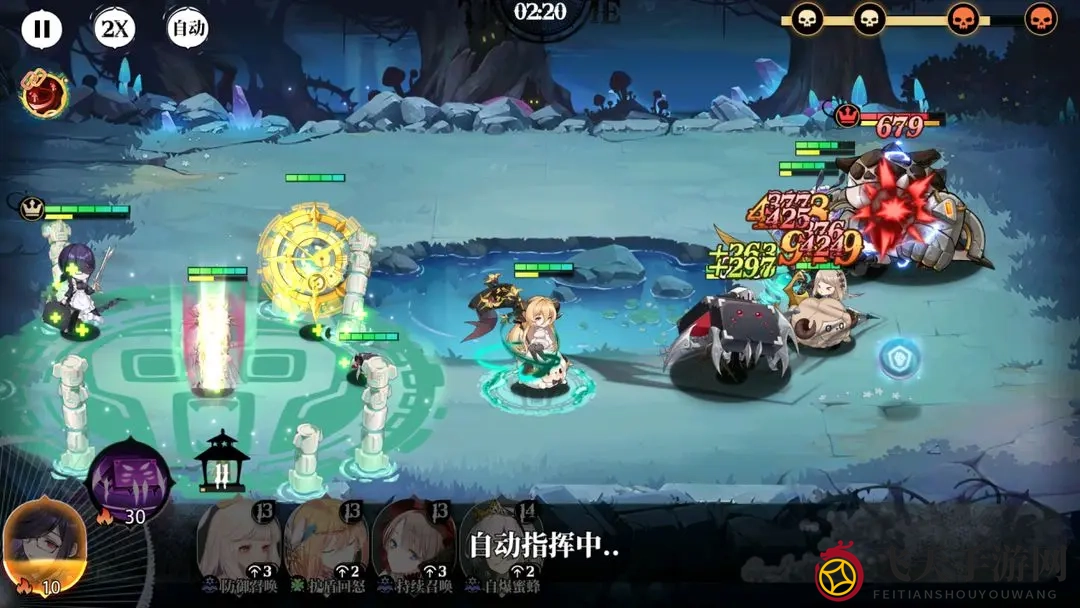 待召唤物集结完毕,即可开始推进。忒洛斯可置于人多的前排或后方支援队长。随着召唤物的推进,若遇敌方强AOE或精英怪,可派罗兰朵上场应对。