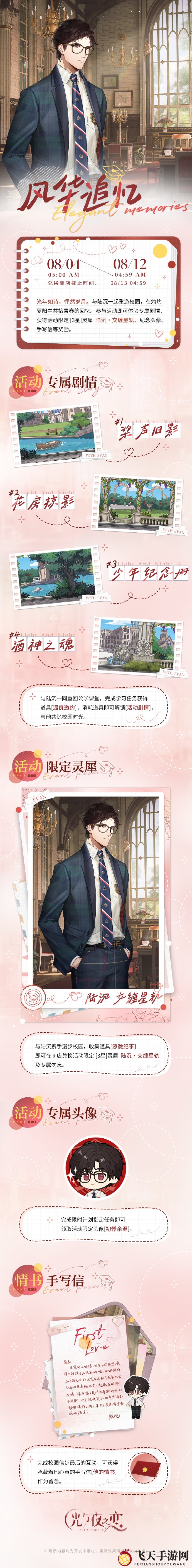 活动亮点:时光流转,与陆沉一同重返校园,沐浴在夏日阳光下,重温青春岁月。参与活动,即可深入专属剧情,赢取活动限定 [3星]灵犀 陆沉?交缠星轨、纪念头像、手写信等丰厚奖励。