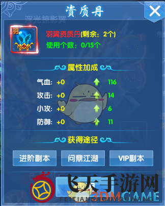 羽翼升级至特定阶数后,可开启资质系统。资质等级越高,羽翼阶数上限越大。使用资质丹提升资质等级,增加固定属性和人物属性。