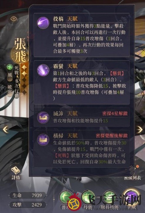 4、张飞拥有丰富的奇闻属性,包括攻击力、生命值和免伤值。他来自涿郡,热爱绘画,拥有纵火、传谣、下毒等多种探索能力。