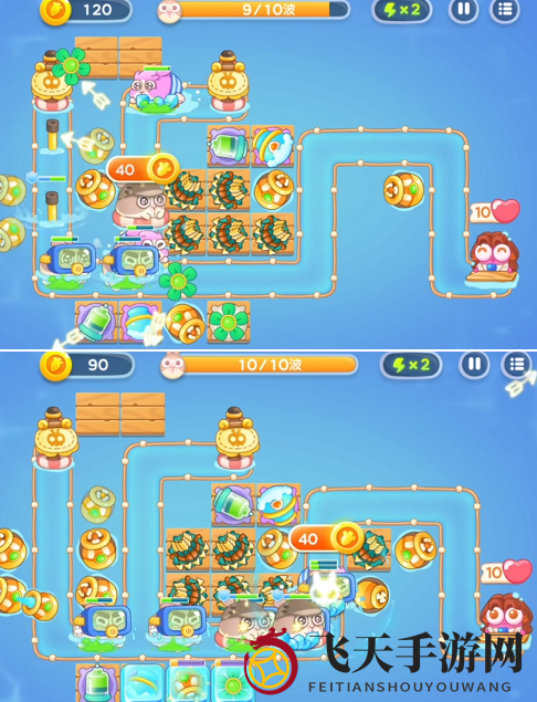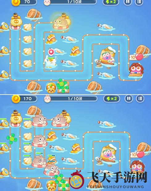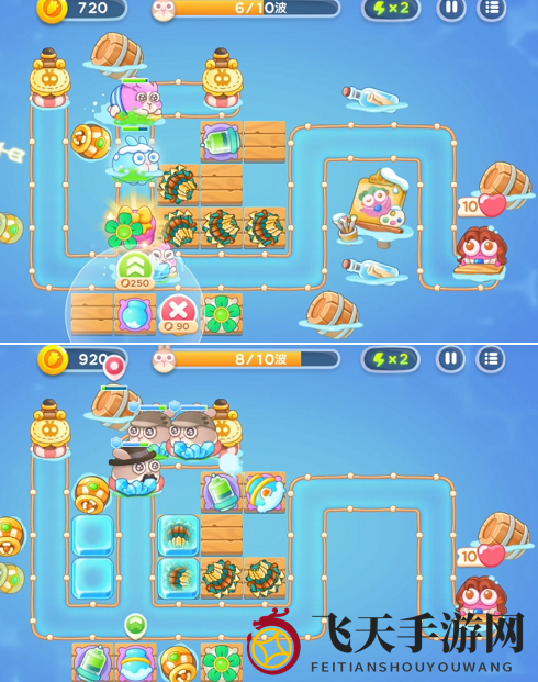 3、第5至8波,合理布置雪球,避免在炮塔密集区击杀冰冻兔。鱼雷应尽量布置在出口附近。