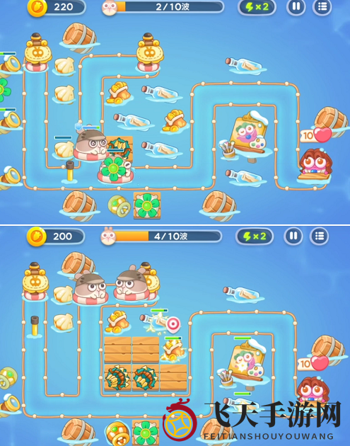 2、第二波敌人来袭,潜水兔也将现身。建议将所有鱼雷升级至顶级,在木板上设置多重箭矢,并在左侧预留一枚鱼雷。