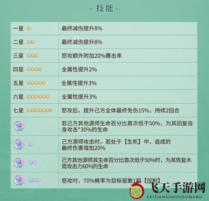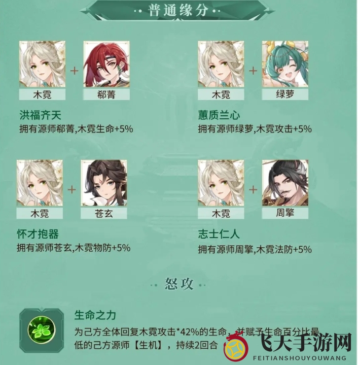 木霓的生命之力可为团队中的所有成员恢复攻击力42%的生命值,同时为生命值最低的己方源师施加【生机】效果,持续2回合。