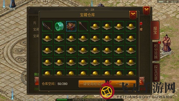 终极速成之道——探宝活动,可获取大量经验丹和装备。优质装备自行穿戴,普通装备尽情享用。狂热点击探宝,前往宝藏仓库吸收经验丹,享受经验与等级飞速增长的快感!