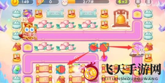 4、电母的路径大部分在下方,因此上方的兔子几乎不会遗漏。第二个是合体神仙,虽然有些棘手,但可以锁定头部进行攻击,多设置一些炮塔。请参考下图: