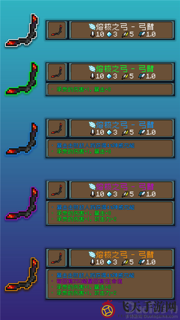 武器部件除了名字外,还有独特效果。长期埋藏地下的部件,受到的侵蚀程度不同,分为白绿蓝紫橙红6个品质,红色品质的武器部件只能从击败boss后掉落的宝箱中获取!
