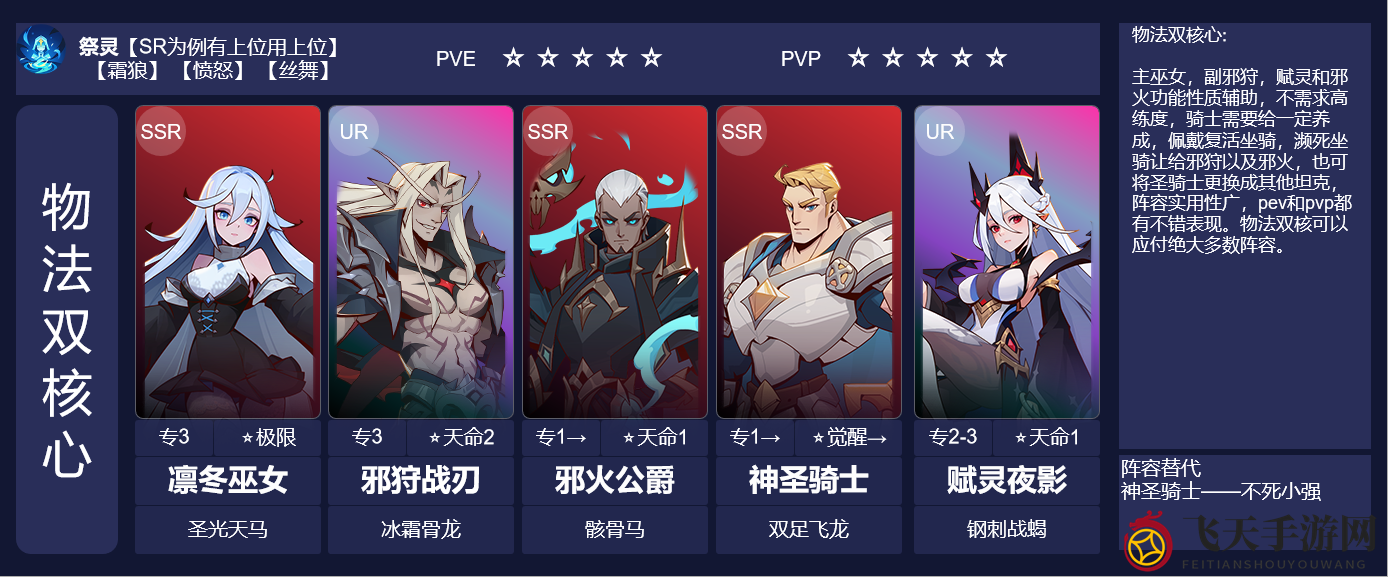 【阵容特点】巫女居中,邪狩、赋灵与邪火协同作战,练度轻松可达。骑士强化适中,配备复活与濒死坐骑,灵活多变,可根据需要替换其他坦克,阵容适应性广泛,PVE与PVP表现优异。物法双核应对各类敌人,战术灵活多变。