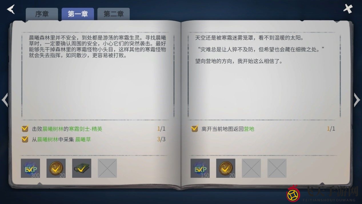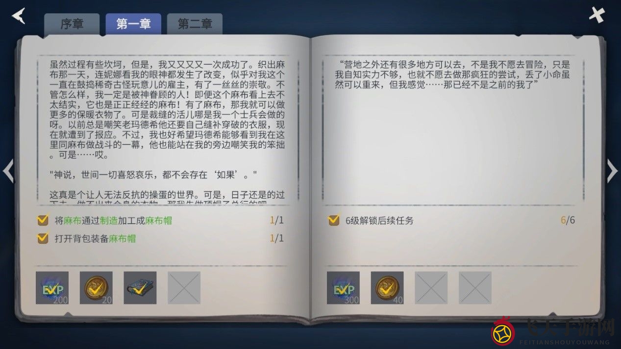 第一章第一幕的任务就此结束。接下来的任务需要达到6级才能继续。如果还没有达到6级,可以打开自动采集功能,在营地收集素材,很快就能达到6级。