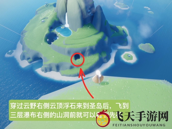 1. 从云野右侧的云顶浮石出发,飞越至圣岛,抵达三层瀑布右侧的山洞前,在大花出口处即可遇见先祖;