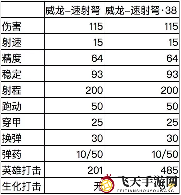 在性能上,“威龙-速射弩”作为弓弩武器,在游戏中与狙击步枪相仿,其9级和改·38的属性如下。