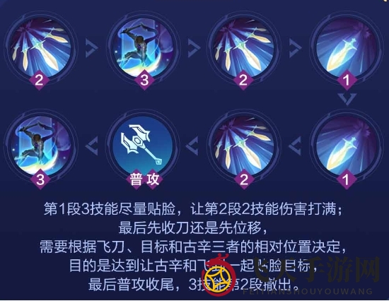 古辛将短剑投向指定方向,标记第一个命中的目标。再次使用,可位移至目标身后。
