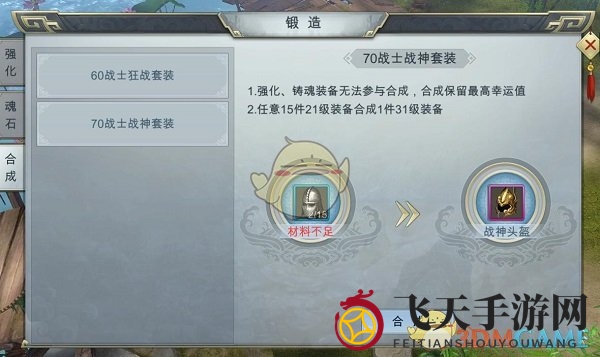合成需15件相同的装备(男女装备需分别处理)以及金币。条件满足后,点击合成即可获得更高级别的装备,最高可达70级。