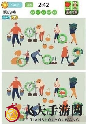 《全民找茬2》第23关答案:花、扫地垃圾、蔬菜、栽种的数量、草堆