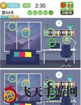 《全民找茬2》第14关答案:墙上的画、插花、抱枕颜色、时钟、箱子